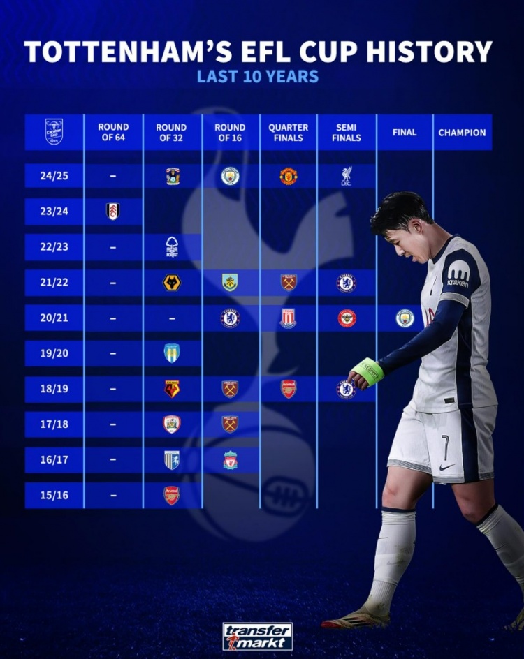 德轉(zhuǎn)也盤點了熱刺近10年聯(lián)賽杯戰(zhàn)績,其中只有20/21賽季打進決賽,當時0-1不敵曼城屈居亞軍。此前還有4次止步半決賽,其余幾個賽季均是早早遭到淘汰。