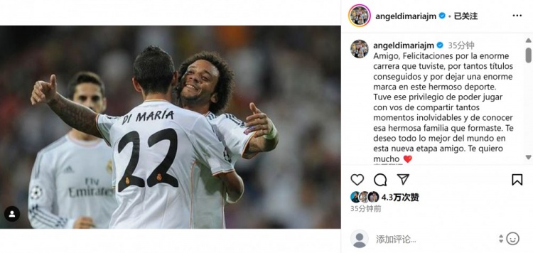 2月7日訊 巴西傳奇球星馬塞洛宣布退役,他在皇馬效力時期的隊友迪馬利亞也在社媒曬出昔日合影為其送上祝福。