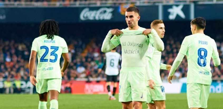 巴薩前鋒費(fèi)蘭今日對(duì)陣?yán)蠔|家瓦倫西亞戴帽,他進(jìn)球后沒有慶祝,并掀開球衣表示對(duì)瓦倫災(zāi)民的紀(jì)念:“別忘記瓦倫洪水受害者”。