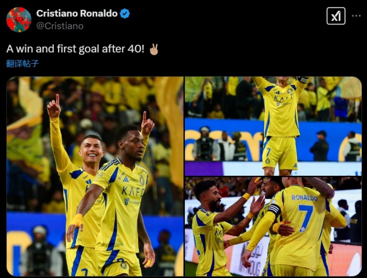 C羅也在賽后通過(guò)社媒曬出自己的慶祝照,并配文:“一場(chǎng)勝利,以及40歲后的第一粒進(jìn)球?!?/p>