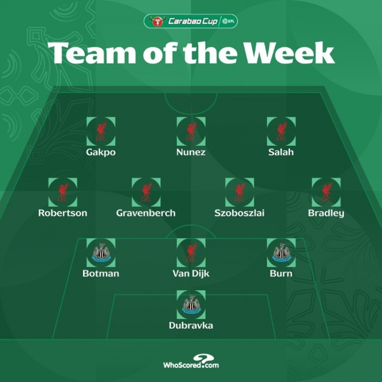 2月8日訊 聯(lián)賽杯半決賽次回合已經(jīng)完賽,紐卡2-0雙殺阿森納、利物浦4-0逆轉(zhuǎn)淘汰熱刺。聯(lián)賽杯官方也評(píng)出了本周最佳陣容。
