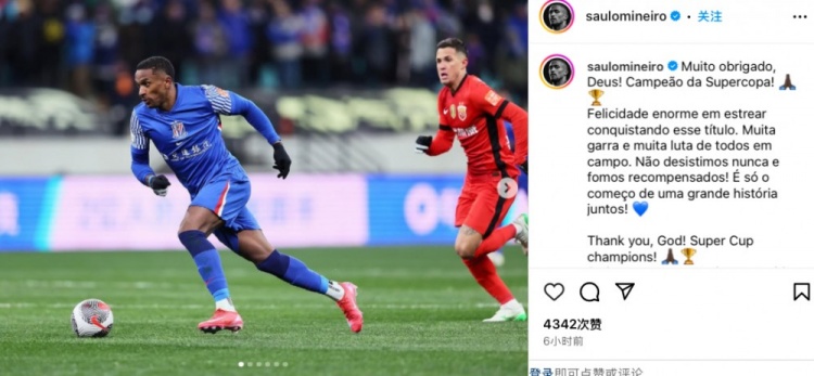 賽后申花新援米內(nèi)羅在社媒發(fā)文慶祝奪冠,他寫道:“感謝上帝,我們奪得了超級(jí)杯冠軍!首秀便能幫助球隊(duì)贏得冠軍,真的讓我感到莫大的幸福,場(chǎng)上所有人都充滿勇氣、全力以赴,從未放棄的我們也得到了回報(bào)!相信這場(chǎng)比賽給接下來(lái)的一個(gè)偉大的賽季開(kāi)了個(gè)好頭!”