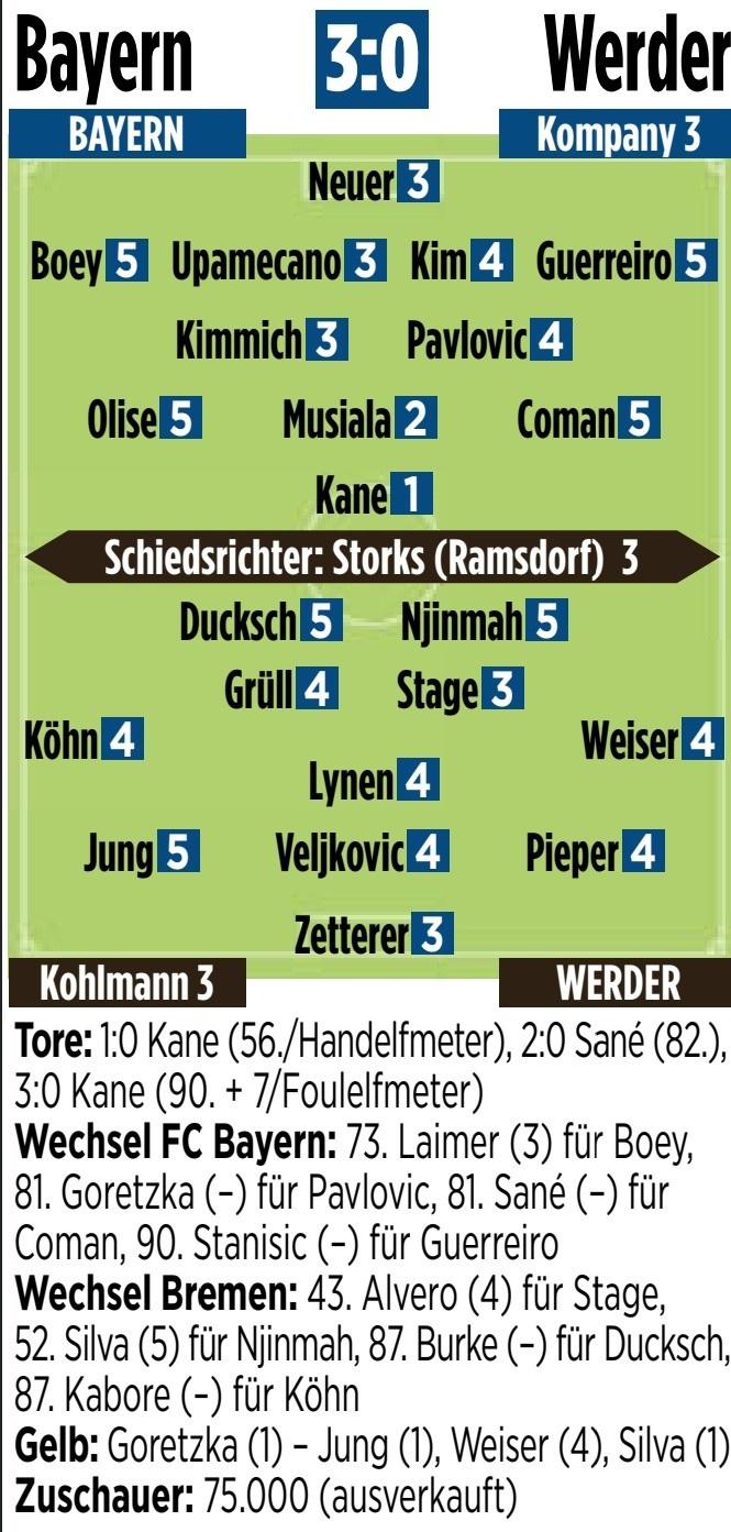 2月8日訊 德甲第21輪比賽,拜仁主場3-0擊敗不萊梅,德國媒體《圖片報(bào)》對(duì)兩隊(duì)球員進(jìn)行了評(píng)分,凱恩1分全場最高,穆西亞拉2分。