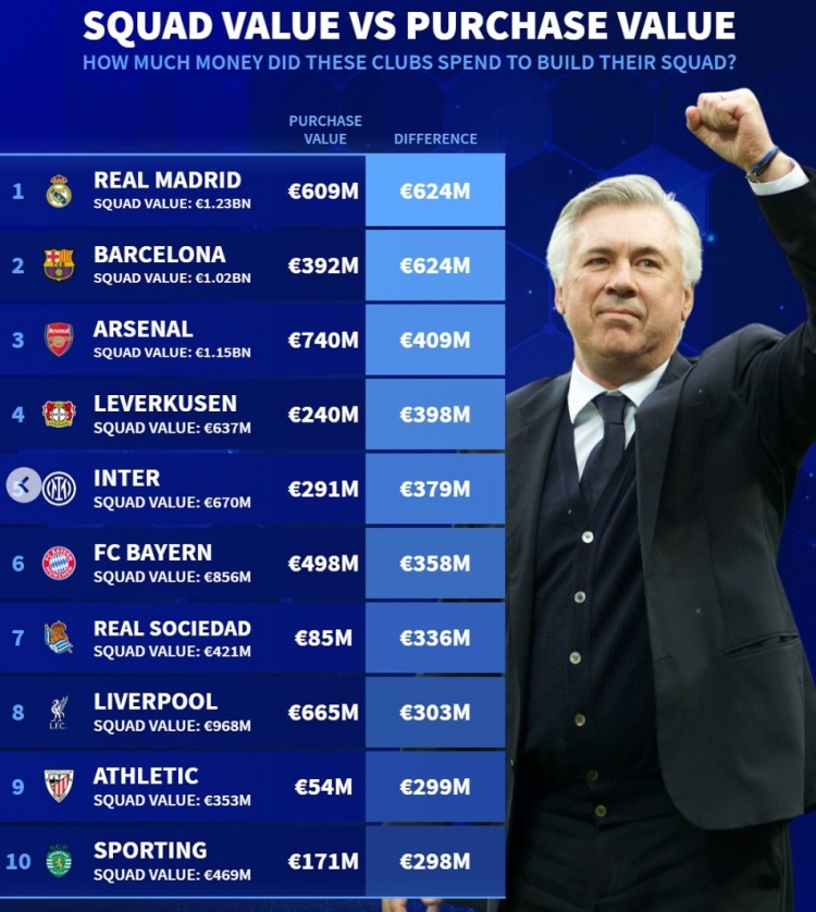 2月8日訊 《轉(zhuǎn)會(huì)市場》統(tǒng)計(jì)了當(dāng)前陣容身價(jià)高于引進(jìn)費(fèi)用情況,皇馬巴薩并列居首。