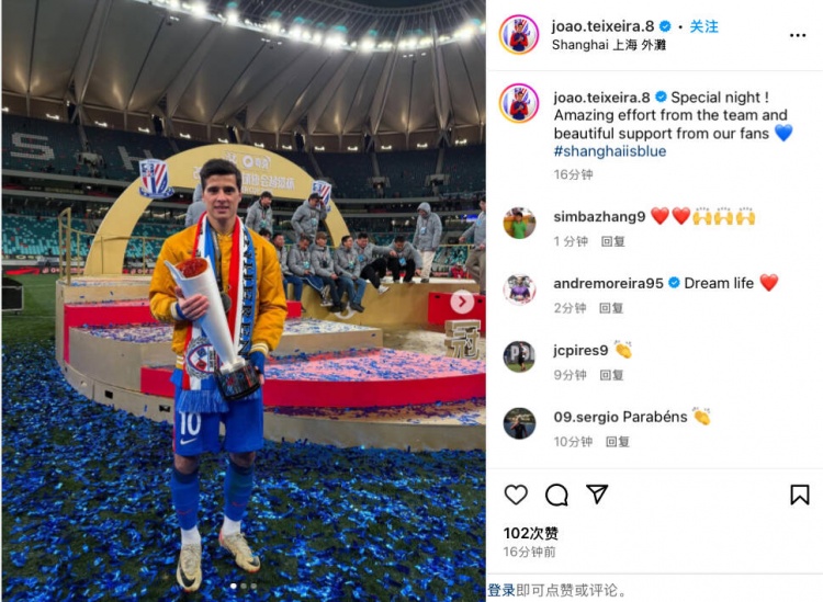 賽后申花外援特謝拉曬出捧杯照慶祝奪冠,他為照片配文寫道:“一個(gè)有著特別意義的夜晚!這場(chǎng)比賽我們的努力是如此巨大,還有球迷們的熱情支持,多么美妙!”