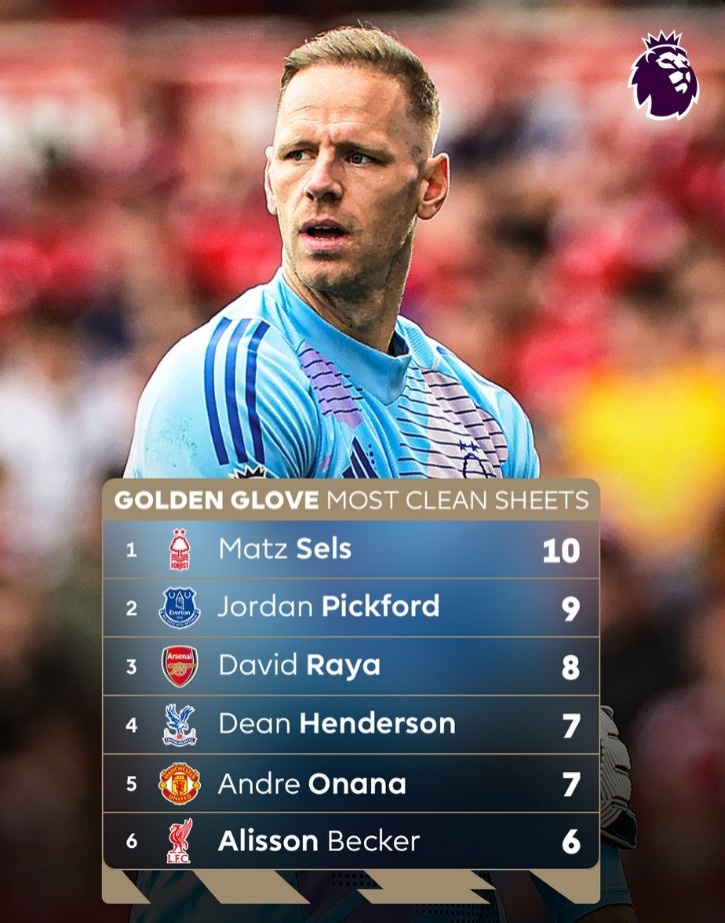 2月8日訊 英超官方盤點了本賽季門將零封場次榜,其中諾丁漢森林門將塞爾斯10場居首,以下為具體榜單: