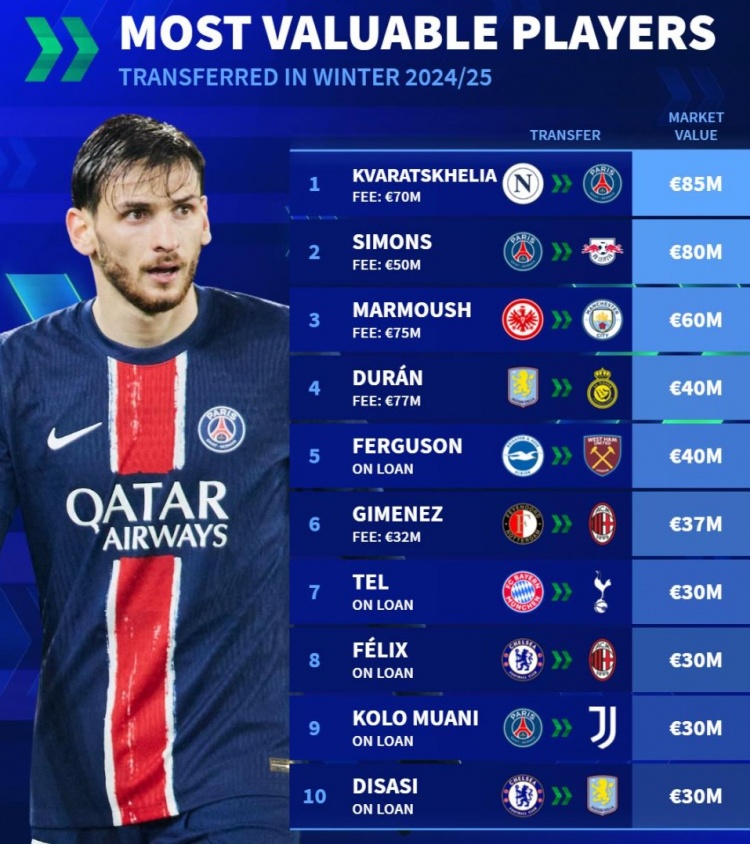 2月8日訊 《轉(zhuǎn)會(huì)市場(chǎng)》統(tǒng)計(jì)了今年冬窗轉(zhuǎn)會(huì)身價(jià)最貴球員情況,克瓦拉茨赫利亞居首。