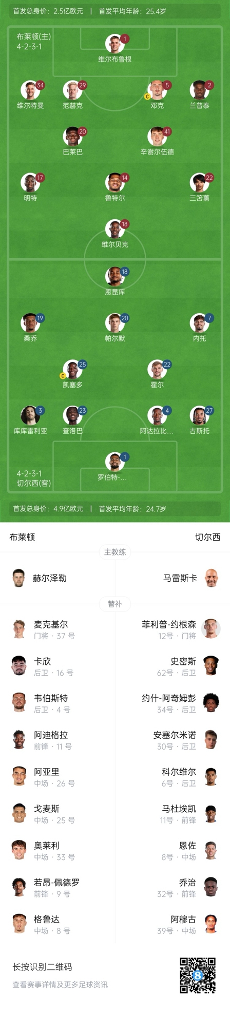 布萊頓替補(bǔ):37-麥克基爾、4-韋伯斯特、25-戈麥斯、33-奧萊利、26-阿亞里、8-格魯達(dá)、9-若昂-佩德羅、11-阿迪格拉、16-卡辛