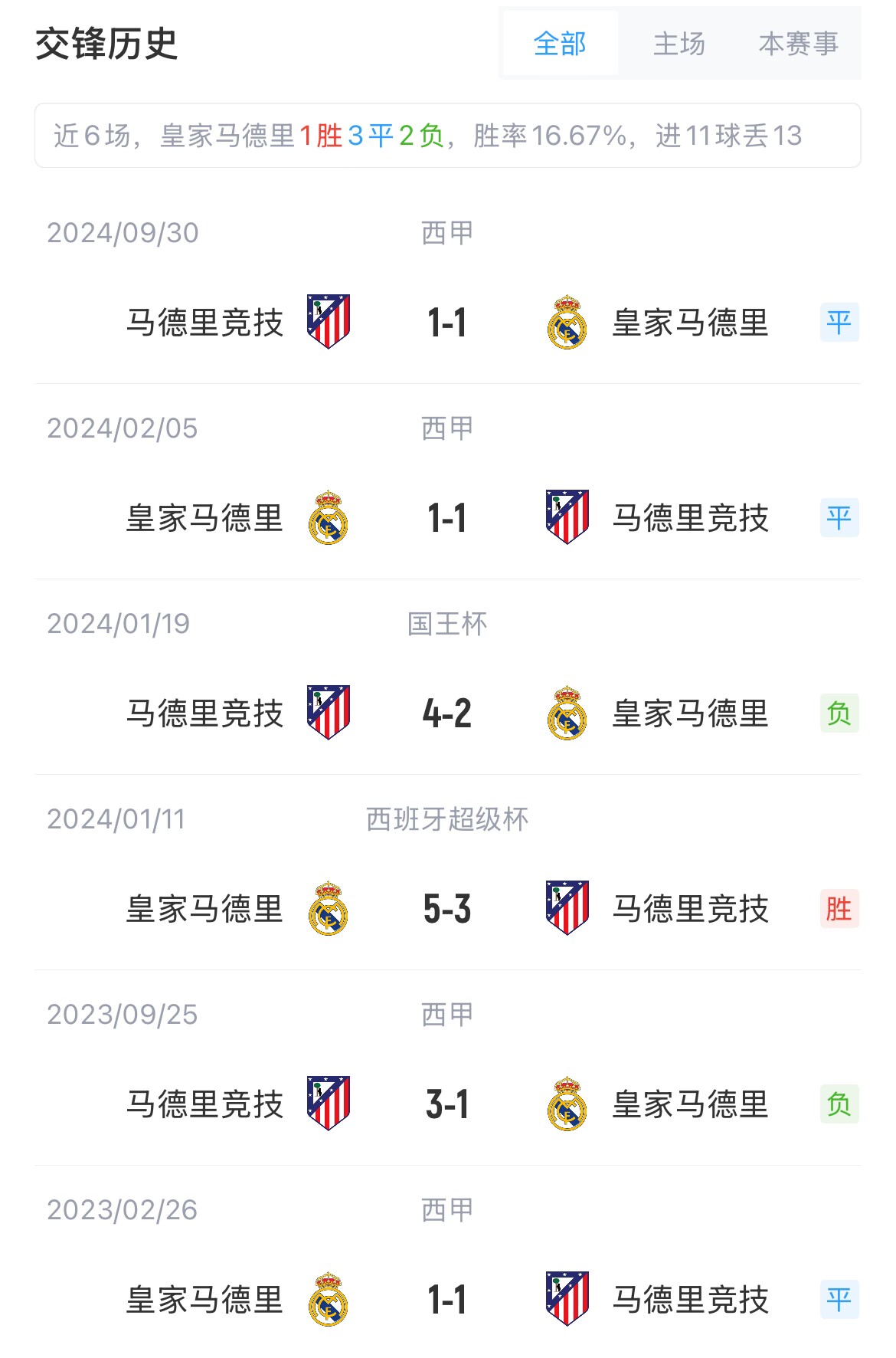皇馬目前以49分排名西甲榜首,馬競48分排在第二。賽季的首次交手中,皇馬客場1-1戰(zhàn)平馬競。