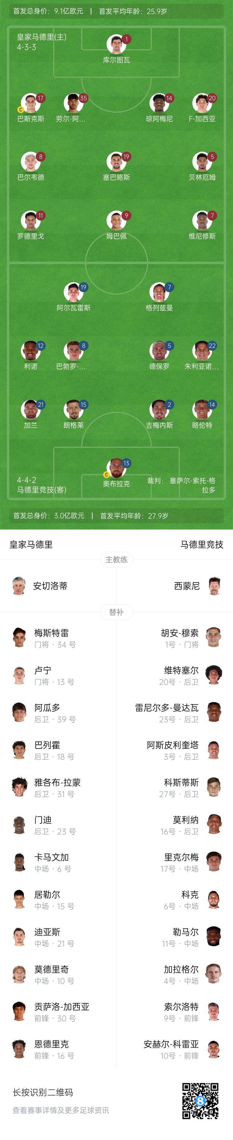 2月9日訊 西甲第23輪迎來馬德里德比,皇馬主場對陣馬競,賽前首發(fā)公布。