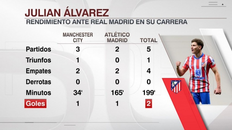 阿爾瓦雷斯對陣皇馬數(shù)據(jù):