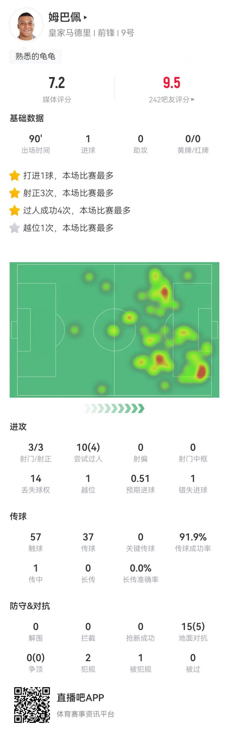 2月9日訊 皇馬在本輪西甲焦點戰(zhàn)1-1戰(zhàn)平馬競,姆巴佩本場數(shù)據(jù)如下: