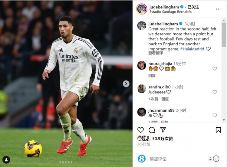 貝林厄姆曬出自己的比賽照片,配文:“球隊下半場的反應(yīng)很好,我覺得我們理應(yīng)拿到更多的積分,但這就是足球?!?/p>