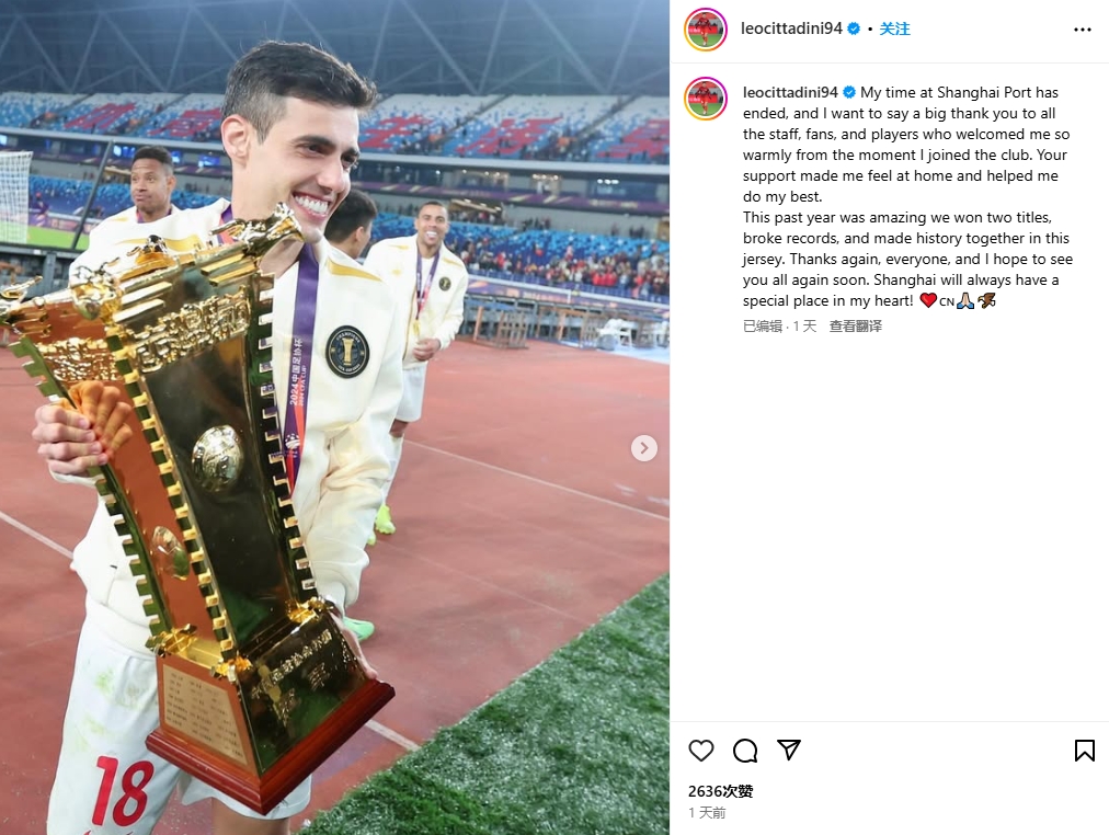 現(xiàn)年30歲的奇塔迪尼,上賽季從巴伊亞租借加盟海港,共代表海港出場(chǎng)35次,貢獻(xiàn)7個(gè)進(jìn)球和6次助攻。租借合同期滿(mǎn)的奇塔迪尼,已經(jīng)正式離開(kāi)了海港,他在社媒發(fā)文寫(xiě)道: