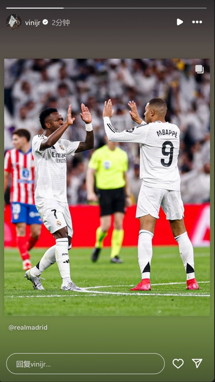 維尼修斯更新社媒動態(tài),曬出與姆巴佩擊掌慶祝進(jìn)球的照片。