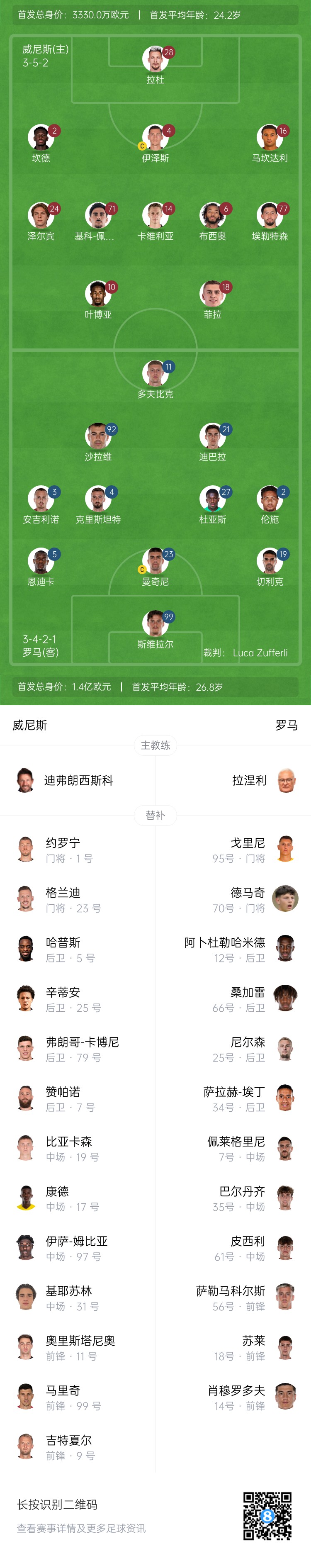 威尼斯替補:1-約羅寧、23-格蘭迪、5-哈普斯、25-辛蒂安、79-弗朗哥-卡博尼、7-贊帕諾、19-比亞卡森、17-康德、97-伊薩-姆比亞、31-基耶蘇林、11-奧里斯塔尼奧