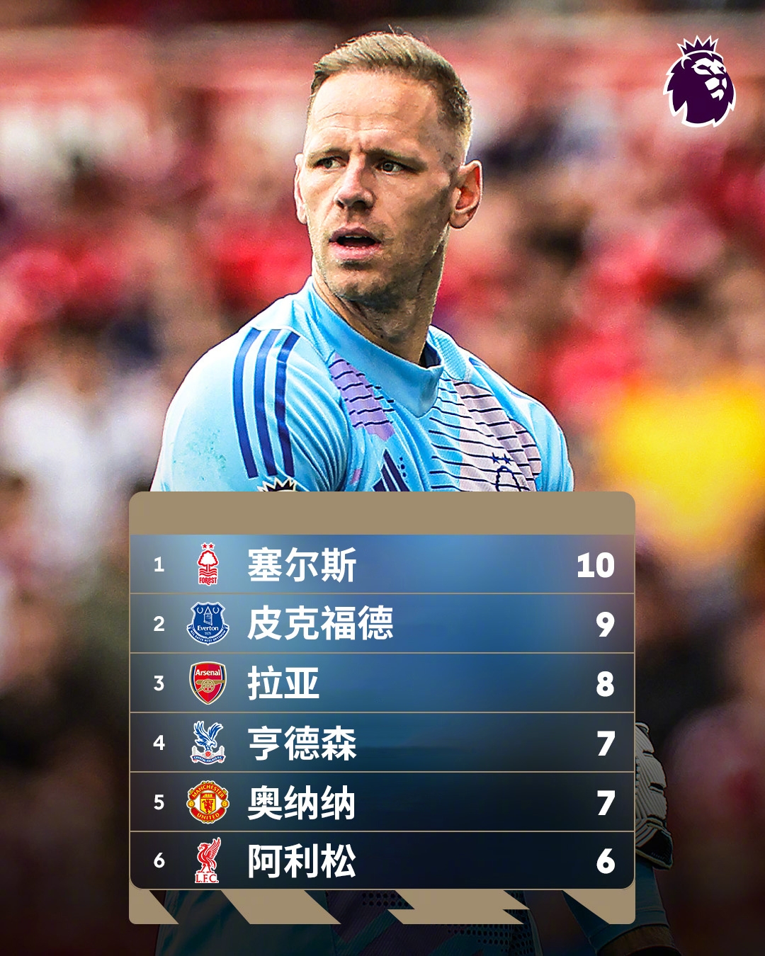 誰能想到?英超金手套獎爭奪形勢:森林門將塞爾斯10次零封領跑