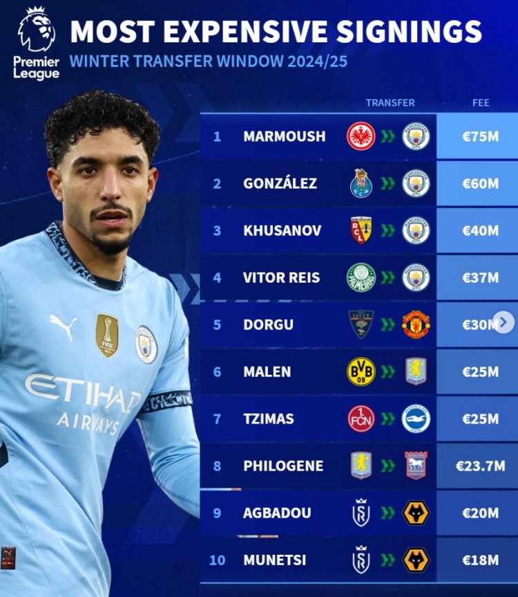 2月10日訊 五大聯(lián)賽冬窗已經(jīng)關(guān)閉,《轉(zhuǎn)會市場》也統(tǒng)計(jì)了本賽季英超冬窗最貴轉(zhuǎn)會榜,曼城獨(dú)占前四。