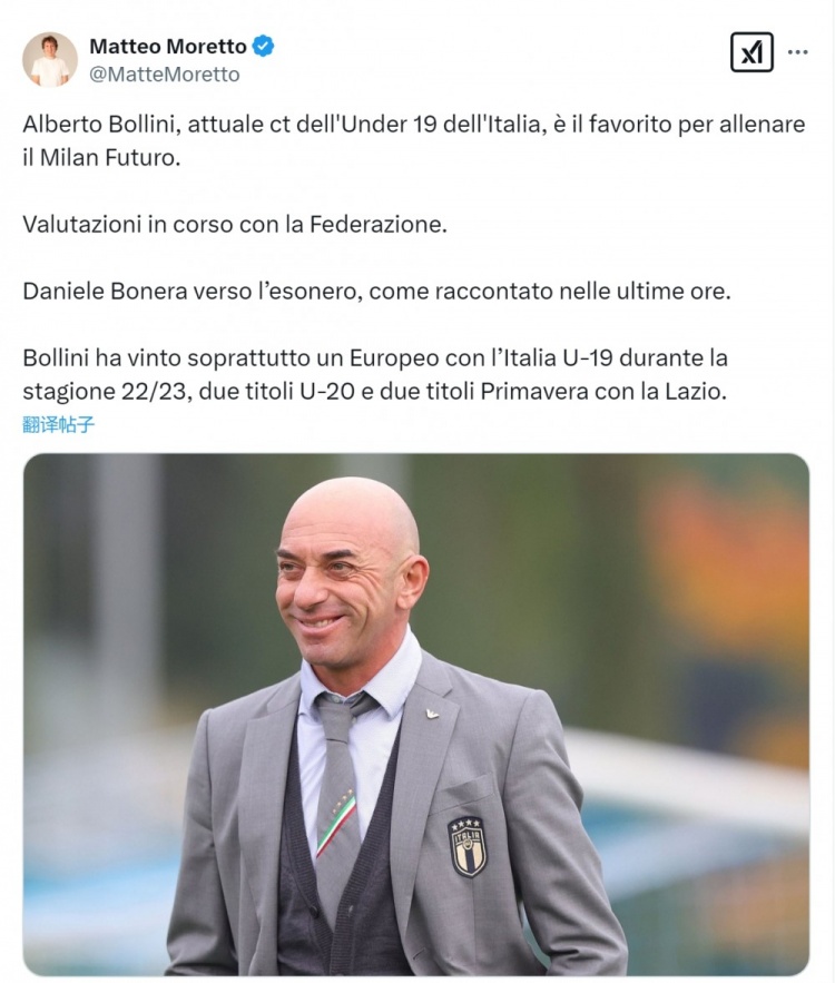 博里尼是一位58歲的意大利教練,曾擔(dān)任薩勒尼塔納、摩德納主帥,帶領(lǐng)意大利青年隊(duì)贏得2023年U19歐洲杯冠軍。