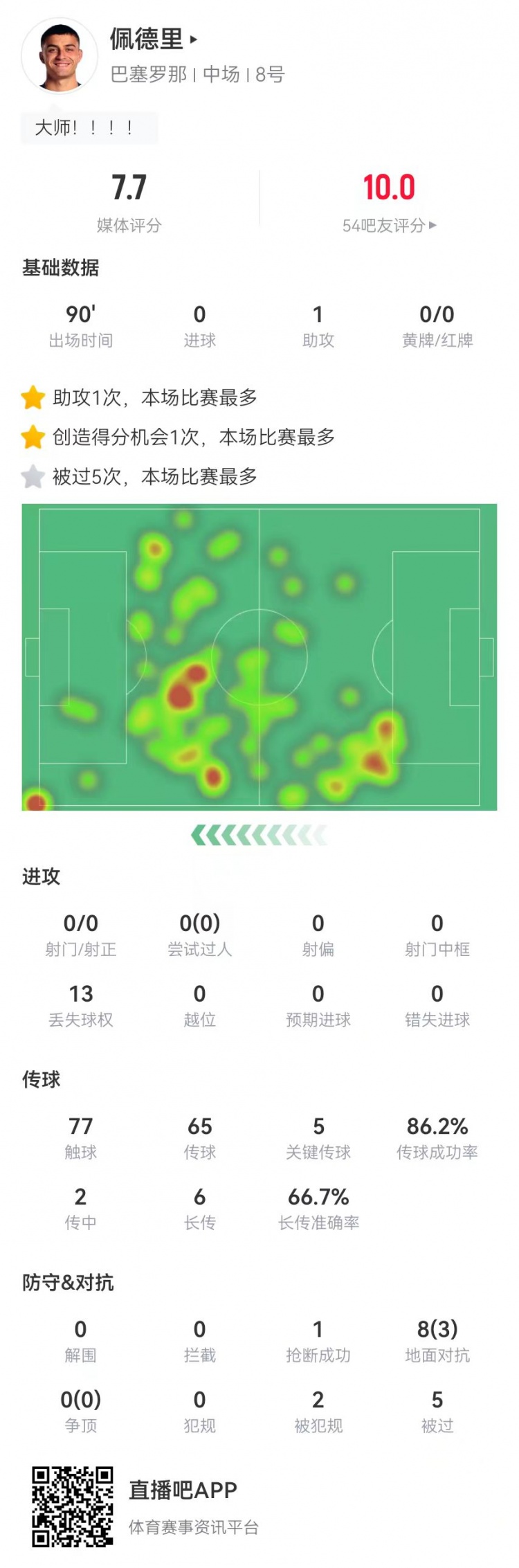 2月10日訊 巴薩在本輪西甲4-1擊敗塞維利亞,佩德里本場數(shù)據(jù)如下: