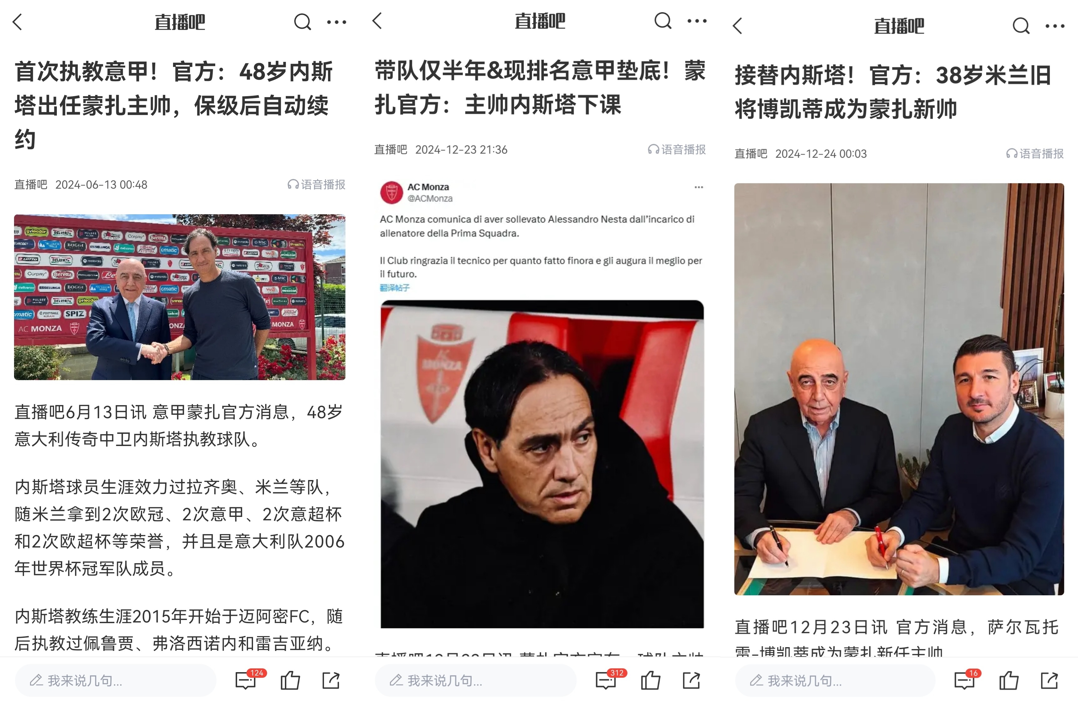 02月10日訊 意甲蒙扎官方宣布,解雇現(xiàn)主帥博凱蒂,再次任命48歲的內(nèi)斯塔執(zhí)教球隊(duì)。