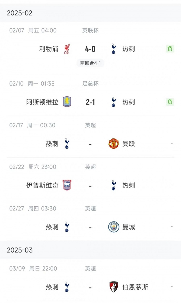 聯(lián)賽方面,熱刺目前8勝3平13負(fù)積27分,排在第14位。接下來4輪比賽,熱刺將對(duì)陣曼聯(lián)、伊普斯維奇、曼城、伯恩茅斯。