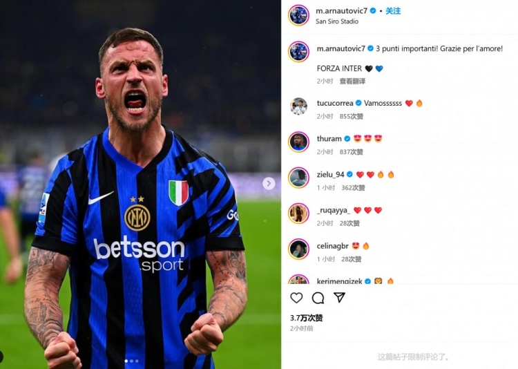 他也在賽后通過社媒曬出自己的怒吼慶祝照,并配文:“重要的三分,感謝球迷們的愛!國米前進????????”