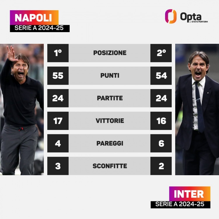 據(jù)Opta統(tǒng)計(jì),那不勒斯和國(guó)米在意甲24輪比賽后僅相差1分,意甲三分制時(shí)代第2次出現(xiàn)這樣的情況,首次是在2011-2012賽季(那不勒斯37分、國(guó)米36分)。