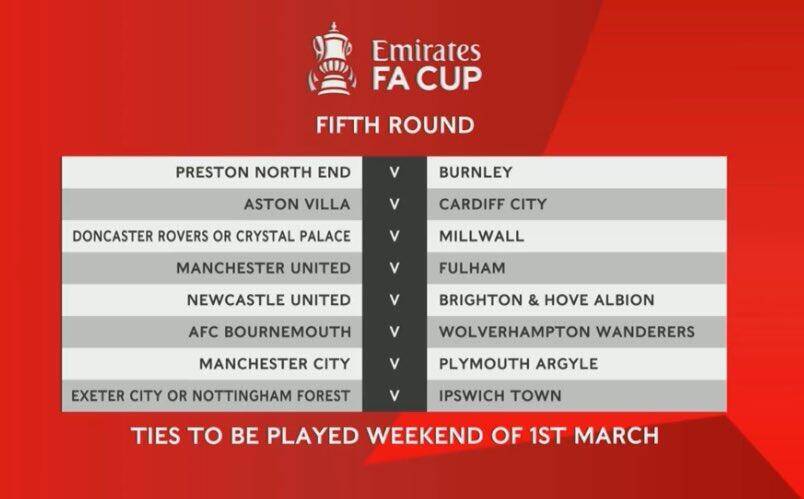 足總杯16強(qiáng)抽簽出爐,曼聯(lián)將對(duì)陣富勒姆,曼城將對(duì)陣普利茅斯,紐卡將對(duì)陣布萊頓。