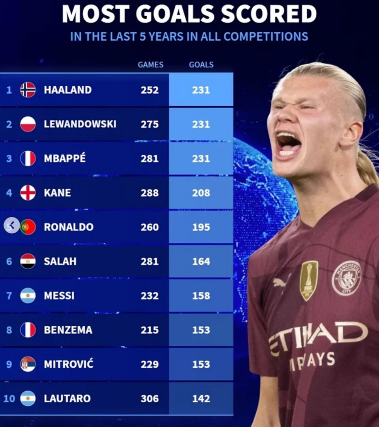 近5年各項(xiàng)賽事總進(jìn)球榜: