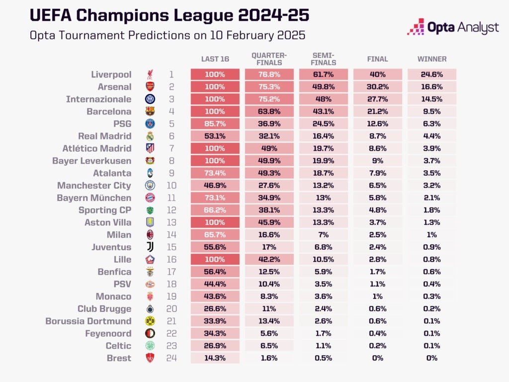 Opta大數(shù)據(jù)預(yù)測(cè)歐冠奪冠概率: