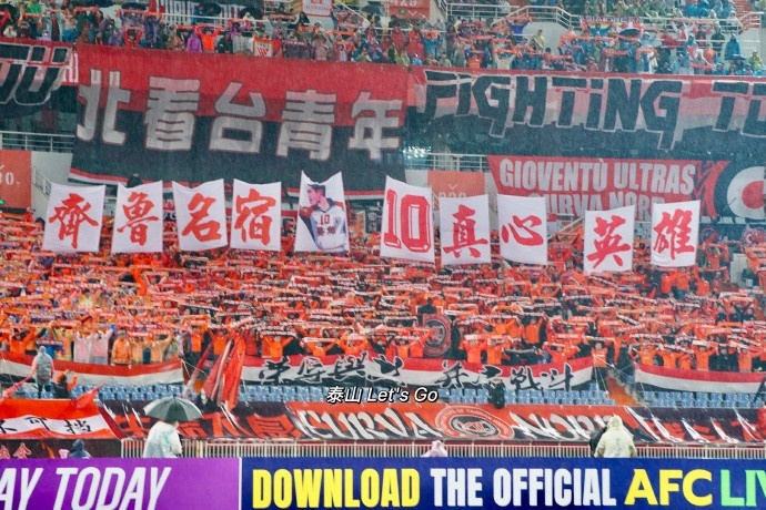 在今晚山東泰山主場對(duì)陣光州FC的比賽中,山東球迷打出標(biāo)語歡迎宿茂臻回歸:“齊魯名宿,真心英雄”。