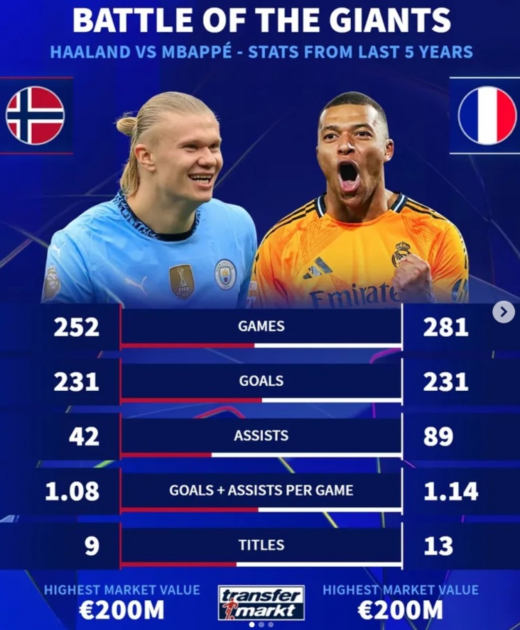 2月12日訊 皇馬和曼城即將迎來歐冠淘汰賽附加賽,《轉(zhuǎn)會市場》也列出了姆巴佩和哈蘭德近5年的關(guān)鍵數(shù)據(jù)對比: