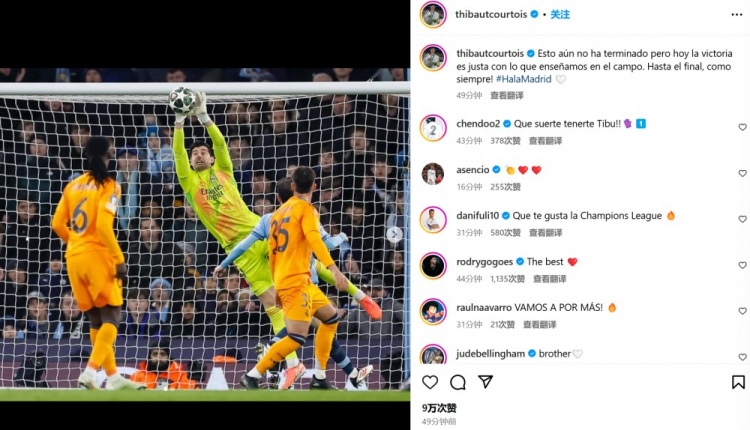 庫爾圖瓦曬出自己進(jìn)行撲救的比賽照,并配文:“比賽還沒有結(jié)束,但考慮到我們的場上表現(xiàn),今天的勝利當(dāng)之無愧。一如既往,戰(zhàn)斗到最后一刻!馬德里前進(jìn)????”