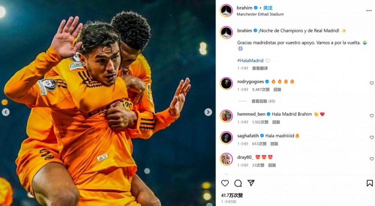 布拉欣-迪亞斯也在賽后通過社媒曬出自己進(jìn)球后舉起雙手拒絕慶祝的照片,并配文:“歐冠之夜與皇馬之夜?感謝皇馬球迷們的支持,讓我們準(zhǔn)備下一回合吧!”