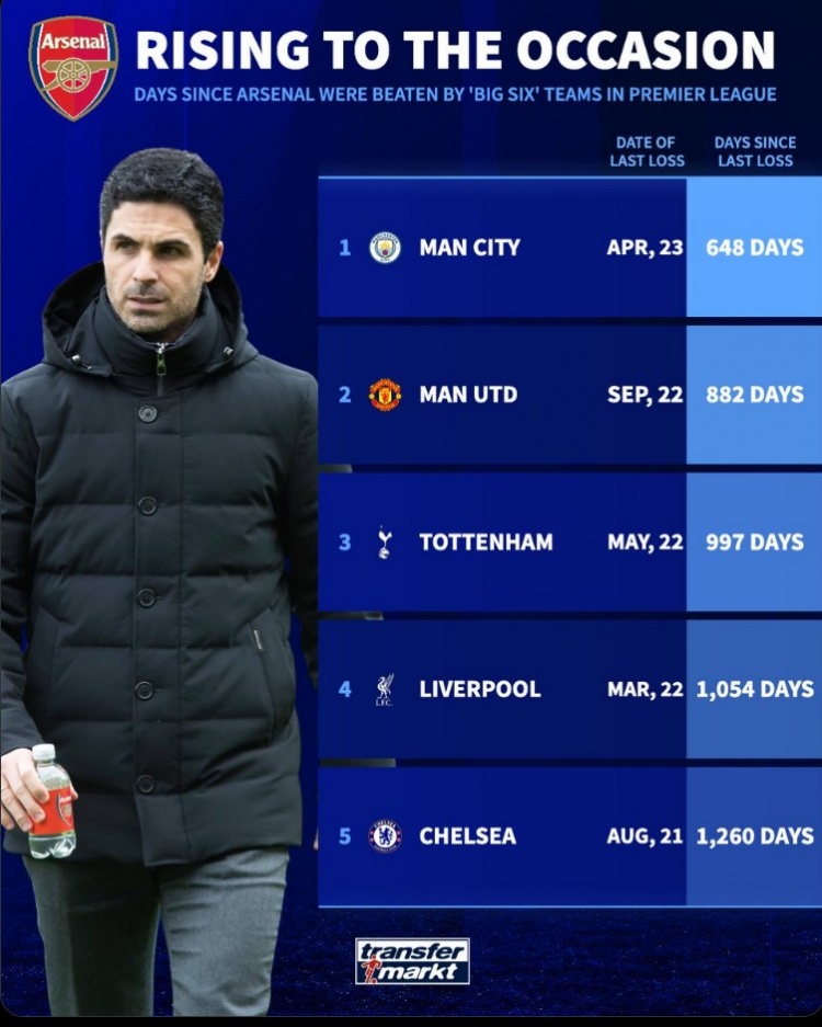 阿森納上一次在英超對(duì)其他Big6輸球還在648天前,對(duì)手正是曼城