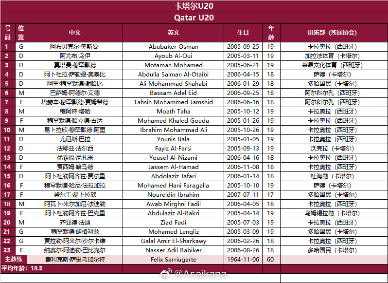 U20國(guó)青主帥是久爾杰維奇,球隊(duì)陣容以05/06年齡段球員組成,不少球員已經(jīng)在所屬俱樂部嶄露頭角,比如王鈺棟、劉誠(chéng)宇、朱鵬宇、毛偉杰、張志雄、杜月徵。而今晚的對(duì)手卡塔爾陣中,23人名單中有13人留洋西班牙。