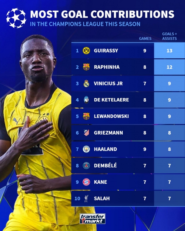 2月12日訊 德國轉會市場統(tǒng)計了本賽季球員在歐冠比賽中參與進球的數(shù)量,并列出榜單,吉拉西參與13球居首,拉菲尼亞參與12球次席。