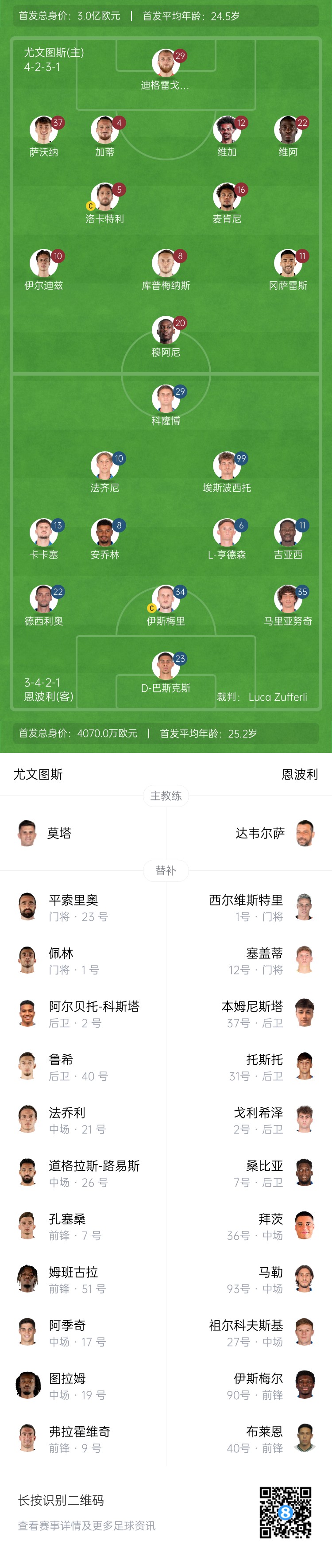 尤文替補:1-佩林、23-平索里奧、2-阿爾貝托-科斯塔、40-魯希、19-凱夫倫-圖拉姆、21-法喬利、26-道格拉斯-路易斯、7-孔塞桑、9-弗拉霍維奇、17-阿季奇、51-姆班古拉