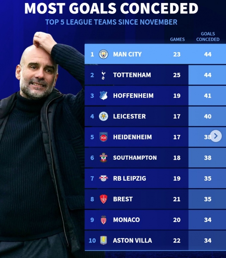 2月13日訊 曼城在本輪歐冠附加賽首回合2-3被皇馬逆轉,防線延續(xù)了近期低迷表現,《轉會市場》統計顯示曼城自11月以來丟球數是五大聯賽球隊最多。