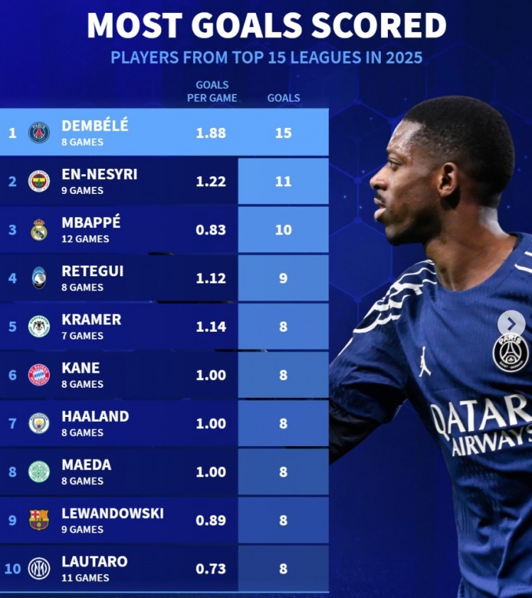 2025各項(xiàng)賽事總射手榜:登貝萊8場(chǎng)15球居首,姆巴佩12場(chǎng)10球第三