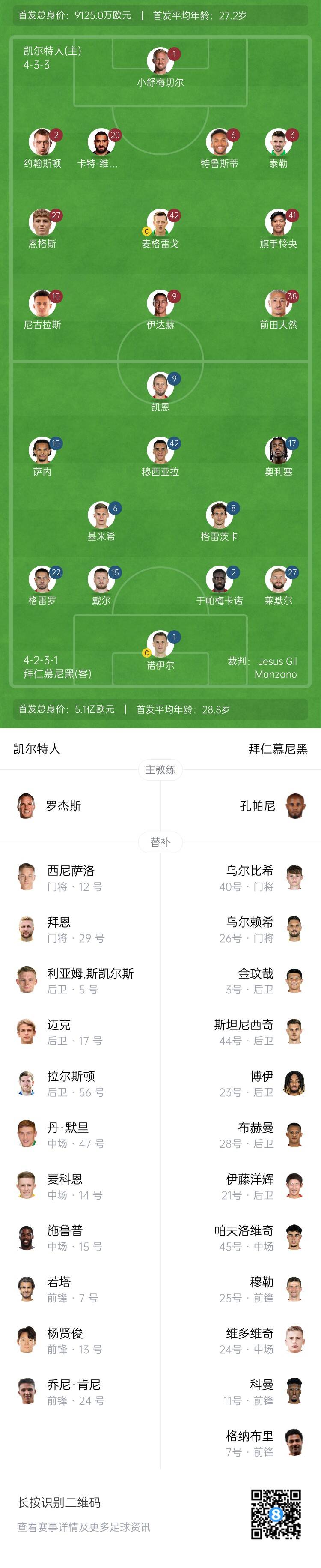 拜仁首發(fā):1-諾伊爾、27-萊默爾、2-于帕梅卡諾、15-戴爾、22-格雷羅、6-基米希、8-格雷茨卡、42-穆西亞拉、17-奧利塞、10-薩內(nèi)、9-凱恩