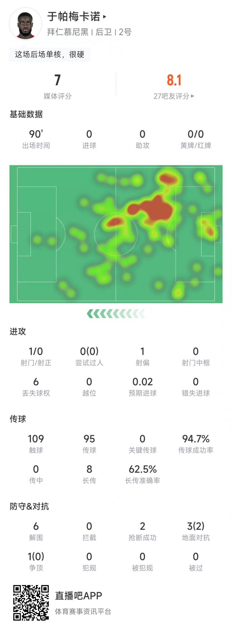 于帕梅卡諾本場(chǎng)比賽數(shù)據(jù):