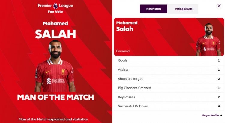 全場(chǎng)比賽,薩拉赫2次射正,打進(jìn)1球,送出1次助攻,他還創(chuàng)造了1次重要的進(jìn)球機(jī)會(huì),送出2次關(guān)鍵傳球,4次過(guò)人成功。