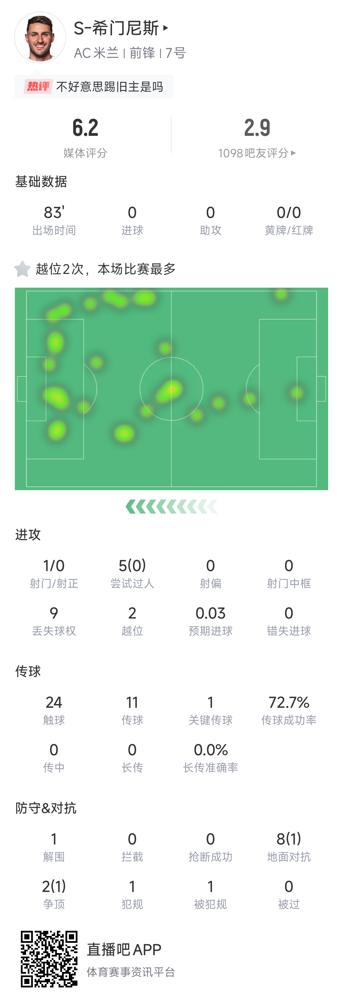 本場(chǎng)對(duì)陣舊主,希門尼斯出戰(zhàn)83分鐘僅有1腳射門,沒(méi)有射正。他5次過(guò)人0成功,8次對(duì)抗1成功,還有2次越位。在24次觸球的數(shù)據(jù)中,希門尼斯9次丟球權(quán),11次傳球72%成功率,包含一次關(guān)鍵傳球。
