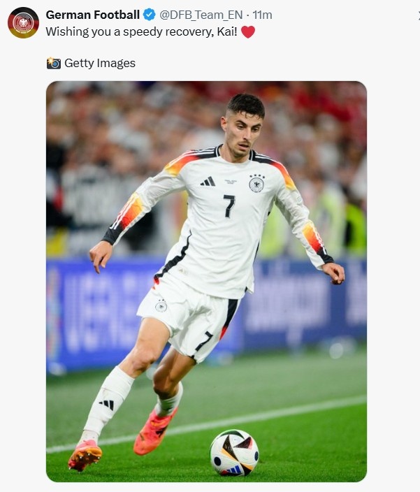 德國(guó)隊(duì)官方祝福道:“祝你早日康復(fù),凱!??”