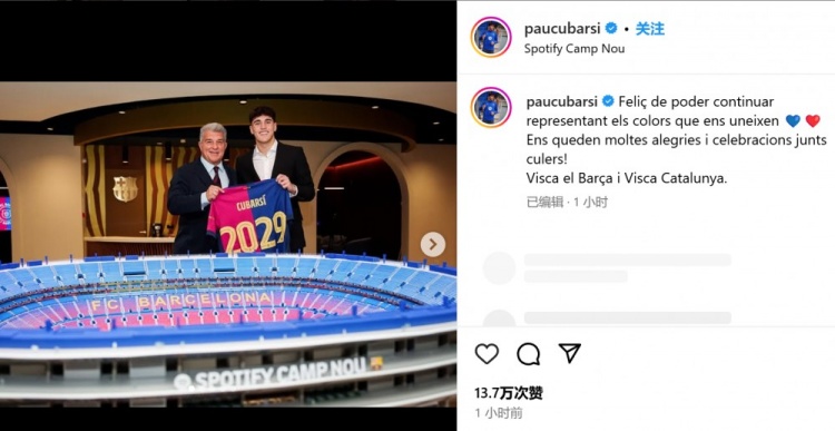 庫(kù)巴西本人也通過(guò)社媒曬出自己和巴薩主席拉波爾塔的合照,兩人共同手持印有2029字樣的巴薩球衣,庫(kù)巴西還表示:“很高興能夠繼續(xù)為巴薩俱樂部效力??????,我們還會(huì)共同經(jīng)歷很多歡樂與慶祝,巴薩球迷們!巴薩萬(wàn)歲!加泰羅尼亞萬(wàn)歲!”