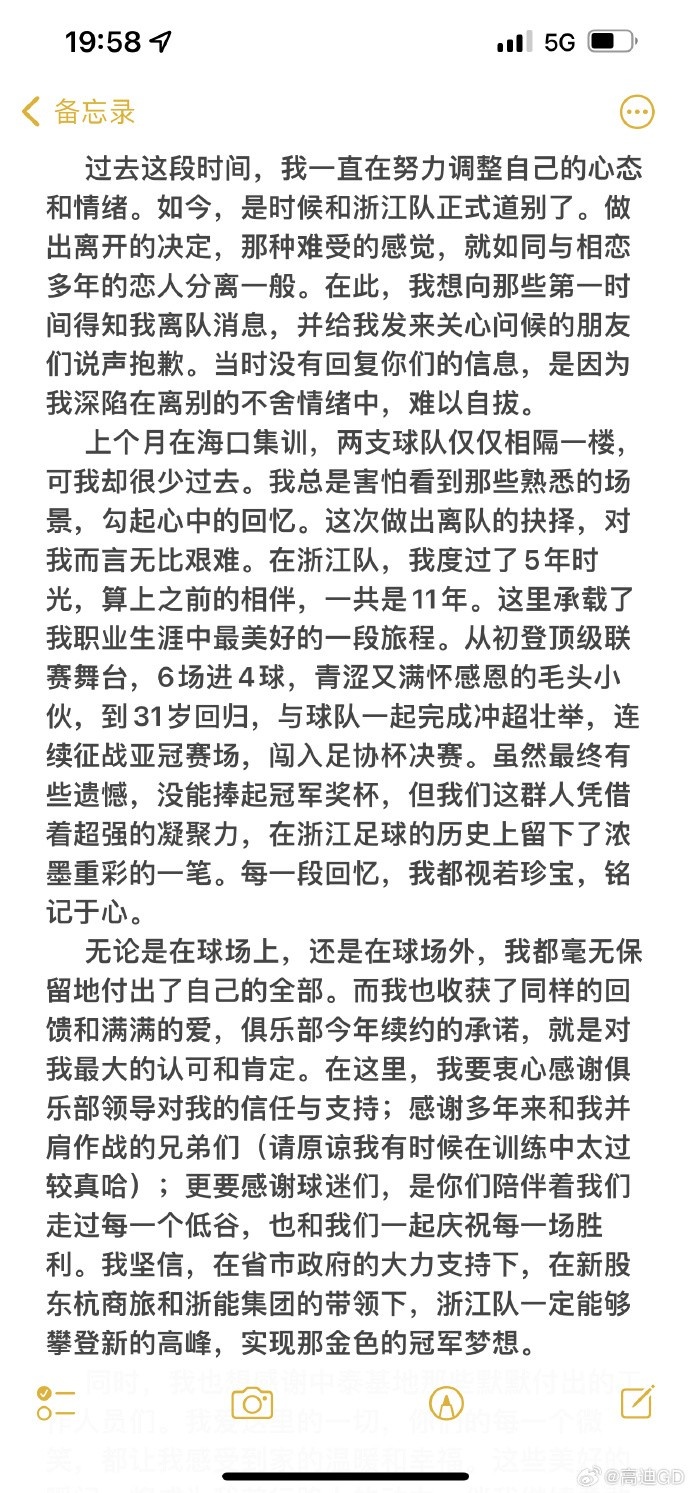 過去這段時間,我一直在努力調(diào)整自己的心態(tài)和情緒。如今,是時候和浙江隊正式道別了。做出離開的決定,那種難受的感覺,就如同與相戀多年的戀人分離一般。在此,我想向那些第一時間得知我離隊消息,并給我發(fā)來關(guān)心問候的朋友們說聲抱歉。當(dāng)時沒有回復(fù)你們的信息,是因為我深陷在離別的不舍情緒中,難以自拔。