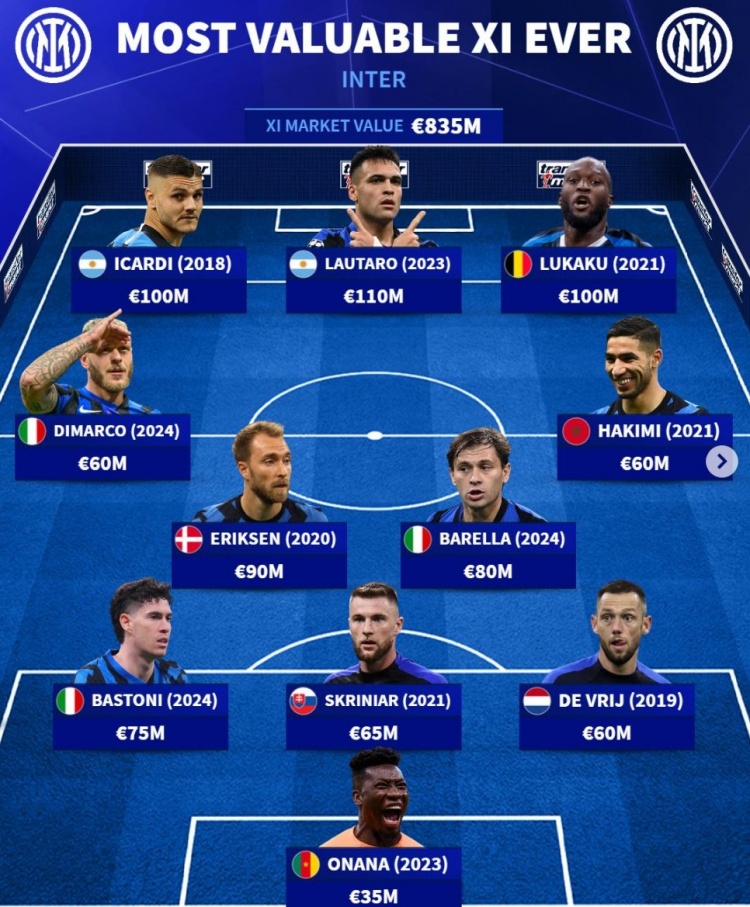 國米歷史最貴陣:總身價8.35億歐元