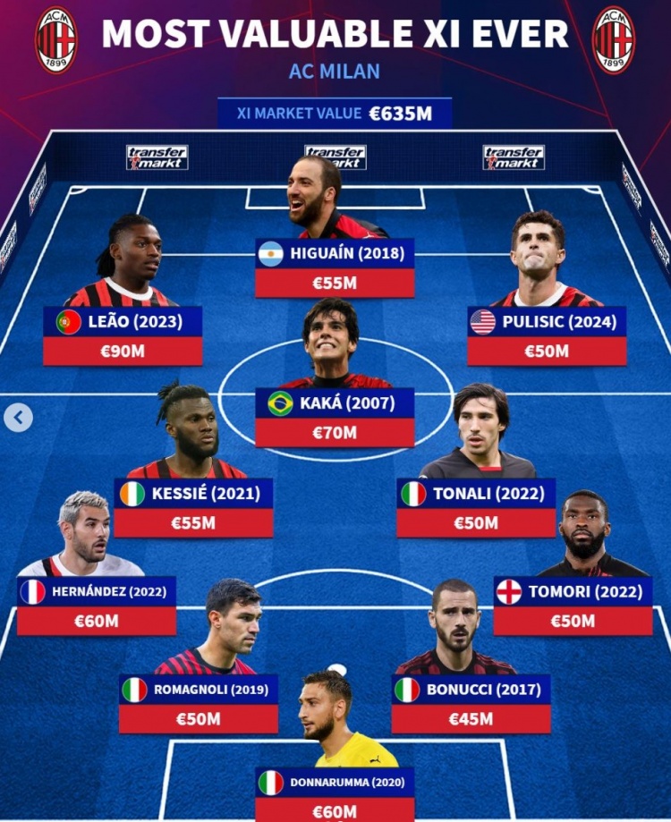 米蘭歷史最貴陣:總身價6.35億歐元